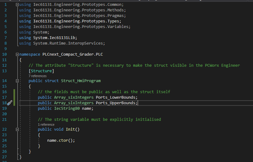 This latest question is not related to the C# variable definitions - it also happens in pure IEC code. You can show this by defining a simple STRUCT type in PLCnext Engineer, declaring two variables of that type, and trying to use the “Write value” action to copy the value of one variable to another. This also doesn’t work, so this is a missing feature of the HMI, not a problem with the C# code.</p>A work-around for this missing feature is for the button on the HMI to set a flag in the PLC which triggers an assignment operation in an IEC program instance.</p>(hint: please start a new conversation for each new issue, that way users who have a similar issue in the future will hopefully be able to find this answer more easily :)</p>