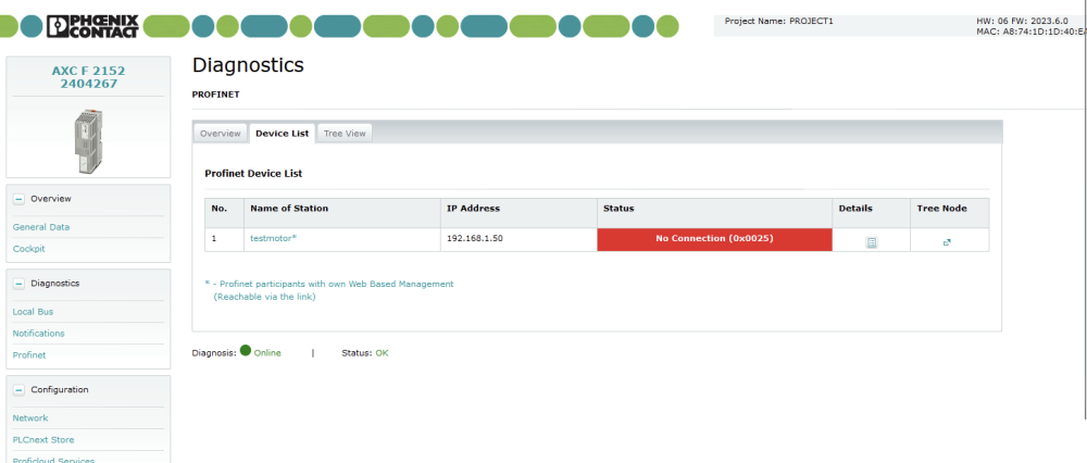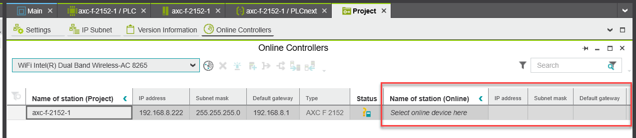 Hello, hereby the answers: Which PLC are you using? = AXCF2152 What firmware version is on the PLC? = I can’t go online (even not with google chroome, but ping-ing is possible), so I can’t see it What version of PLCnext Engineer are you using? = 2021.0.2 build 4.7.1183.0 What is the IP address of the PLC that is discovered by PLCnext Engineer? = 192.168.1.10 What is the IP address of the Ethernet adapter on your PC that you are using to connect to the PLC? = 192.168.1.114