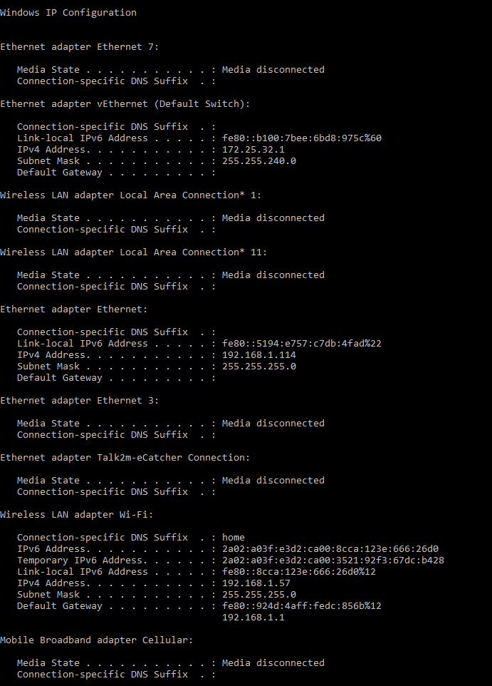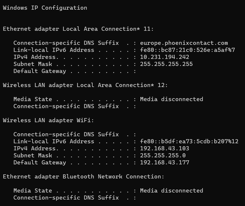 Can you please post the result of the ipconfig command in Windows, and the result of the network scan in PLCnext Engineer, showing the ip address details of the Online PLC? I have attached examples of both. I don’t have a PLC directly connected at the moment, but the area where the address details will appear is outlined in red. What LEDs are on and/or flashing on the PLC?
