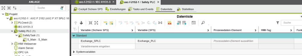I have a project with a 2152 and SPLC 1000. I would like to control an output of the safety plc if the status of the machine allows this and the normal plc agrees. For this I use an exchange variable (not safe). This is written by the normal plc. It is linked in the data list with a non-safe variable of the safety plc. If the safety plc wants to evaluate the variable via the EN_OUT function, I get an error. The variable is read before it is written. I know what this means but I can’t find the error. The exchange between the PLCs should work and the variable is also initialized in the normal plc.