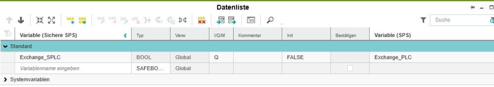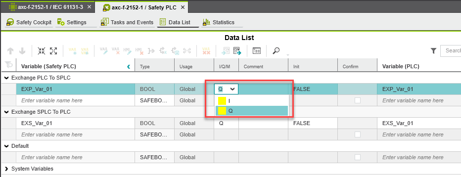 If you create a safety variable (Nonsafe) in the global variable list IEC61131-3, it is created as an output in the global Safety PLC data list by default. Depending on the application, the data direction in the Safety PLC data list must be adapted. It is advisable to create exchange variables in groups in order to have a better overview.