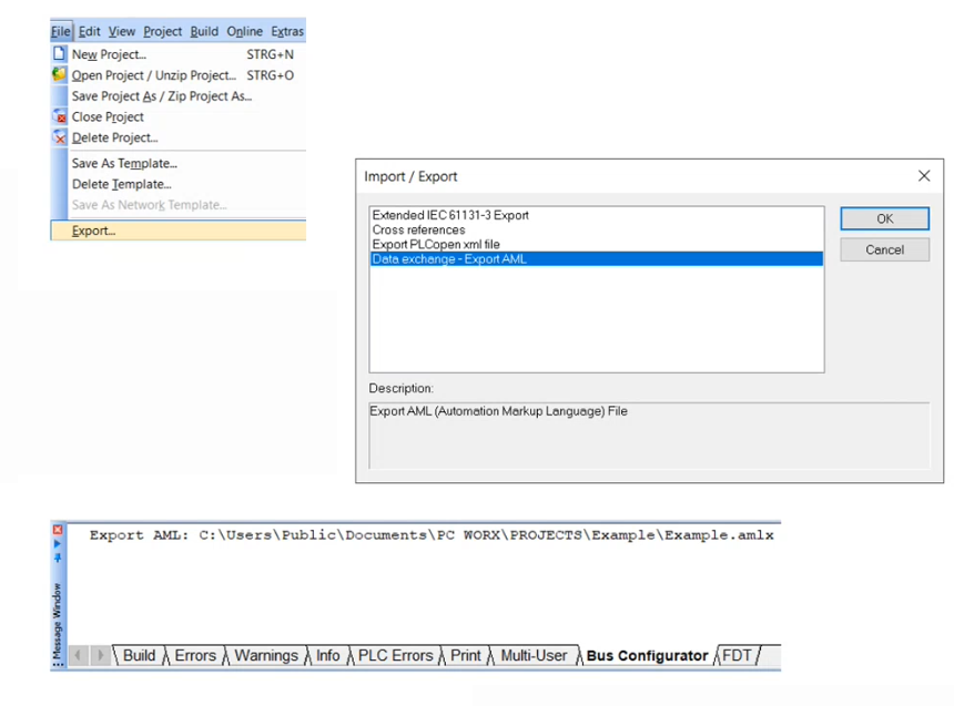 I have downloaded the latest PC-Worx version and also installed the AML_Export function. So far, so good. After rebuilding the program, I can start the Export to AML function. Unfortunately, it stops, throwing this error: