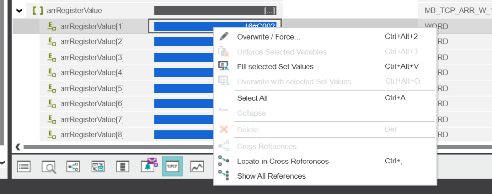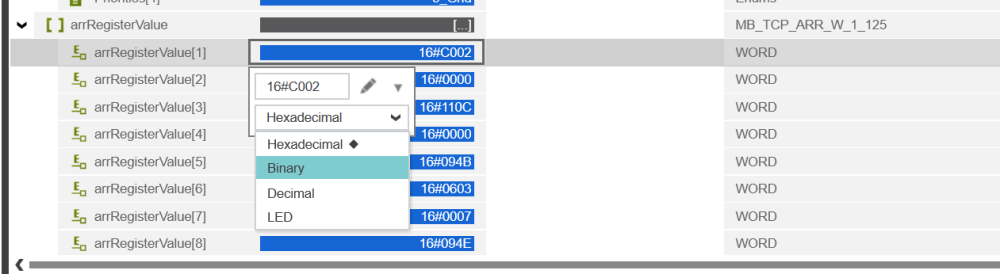 Hello, The screen shot shows the correct behaviour. It looks like you have declared the array arrRegisterValue as an array of INTs. The values of the array elements, from the screen shot are: