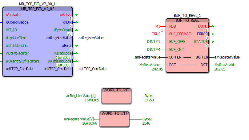 Hello. I use the MB_TCP_FC3, but when i conduct convert data of ‘arrRegister’ terminal (word" to "real) with BUF TO REAL block, the data is incorrect ??.