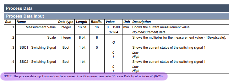 Additionally, the P+F IOL parameters datasheet notes that process data input content can also be accessed using the parameter ‘Process Data Input’ at index 40 (0x28).
