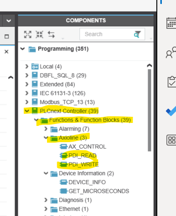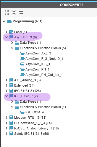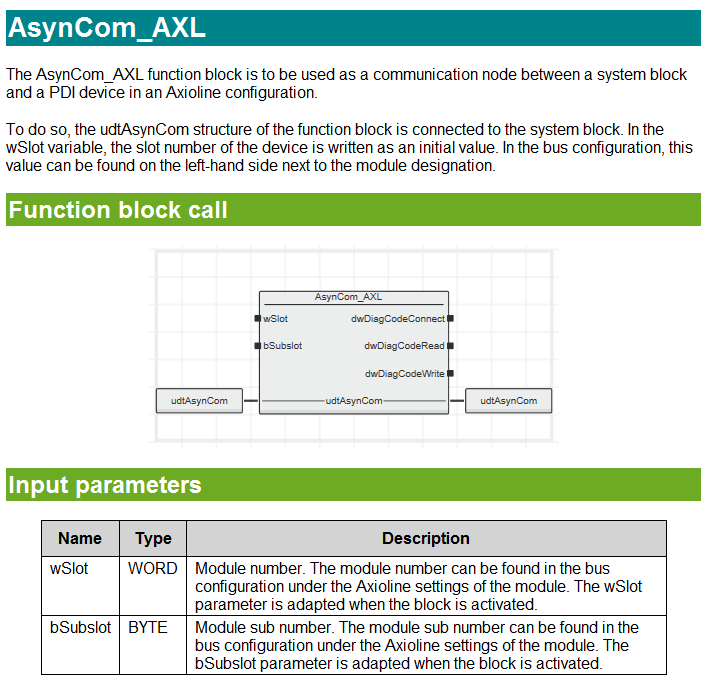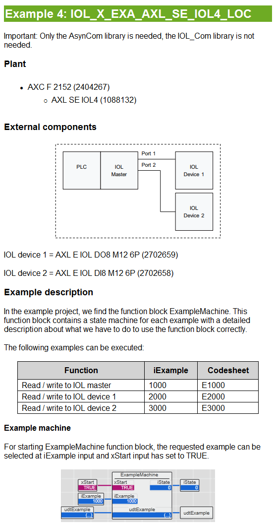 The help file also mentions an ExampleMachine function block – is this necessary in this case? I can only copy this ‘ExampleMachine’ function block from the sample project file – it’s not available for me within the Compononents > Programming > AsynCom or **Compononents > Programming > IOL_Basic_7 **tree, on the. Moreover, there seems to be a need for the AsynCom function block. I’m unsure if wSlot and bSubSlot need to be manually entered, or if they are read automatically. The help file mentions: wSlot WORD Module number (found in the bus configuration under the Axioline settings of the module, adapted when the block is activated) and bSubslot BYTE Module sub number (also found in the bus configuration, adapted when the block is activated).
