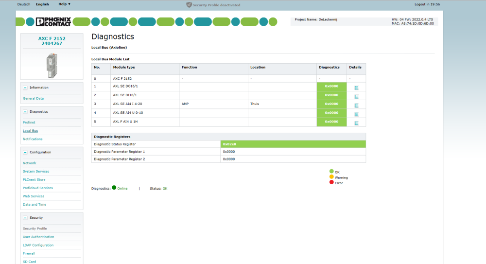 Hi Steve, thank you for your comment. yes indeed the AXL SE analog modules doesn’t work. I also have installed a AXL SE Digital module which works fine. I have an AXL F BP SE4, all leds flashing green, and the up lights is green. On the AXC F 2152, LED BF-D is flashing red. I have included a screenshot of diagnostics. I didn’t think I had a error, but I haven’t been working with the plcnext for very long.