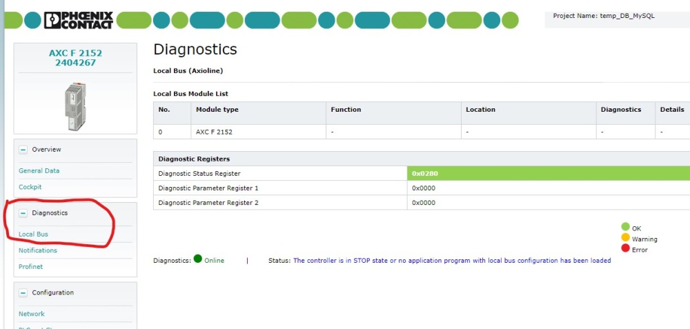 If you go to the WBM for the AXL 2152, there is a page that shows the state of your local bus (see screenshot). Do you have any diagnostics that may indicate an error?