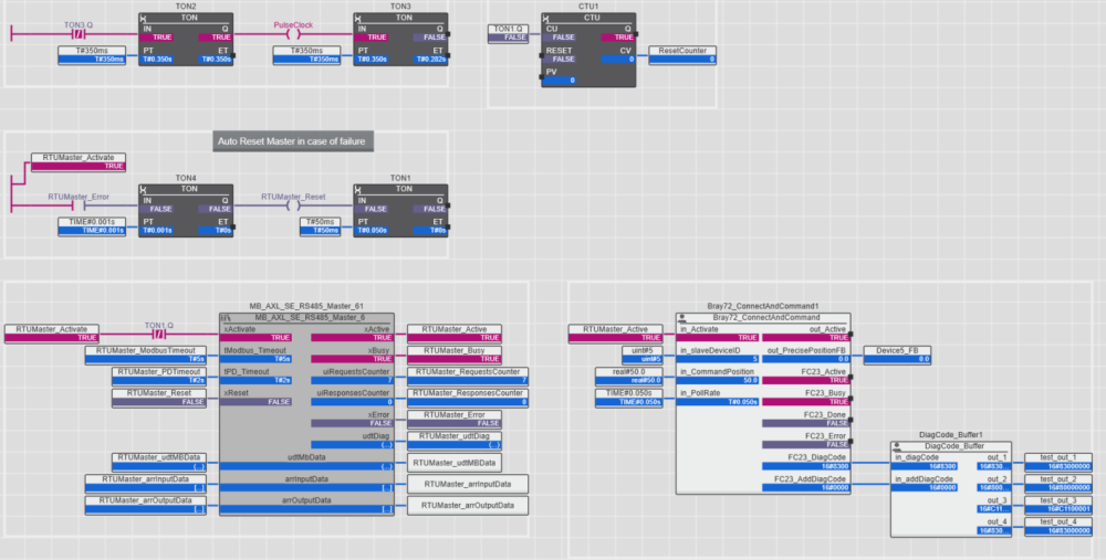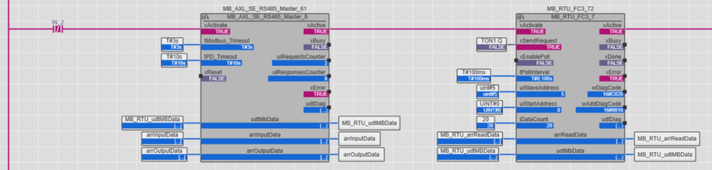 I am having a timeout error communicating with a modbus sensor. I am using PLCnext Engineer 2023.0.5 Build 6.0.416.0 Rev f248e370. I am trying to use the ModBus_RTU_13 Library on a AXC F 2152 with an AXL SE RS485 to read data from a temperature and humidity sensor. I have checked my serial parameters are matching, but I’m not sure if there is something else I am missing?