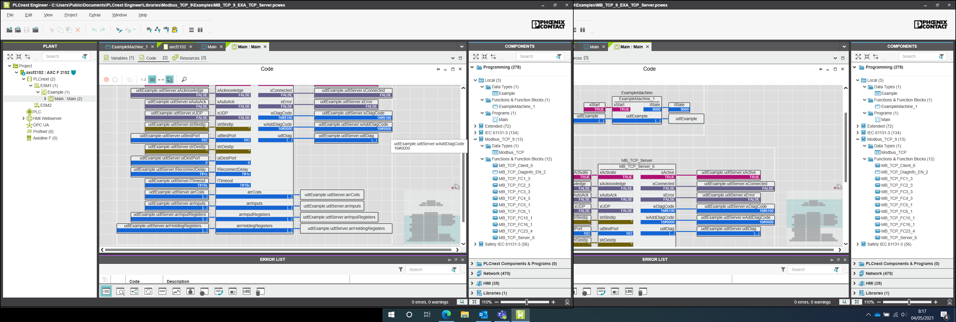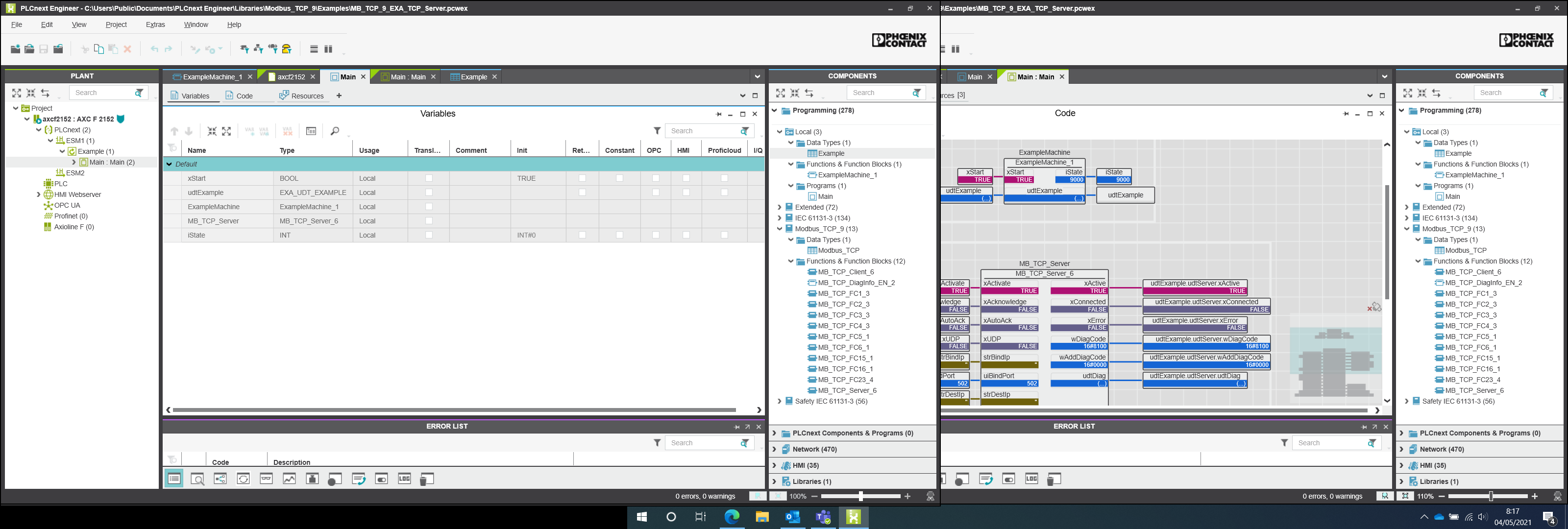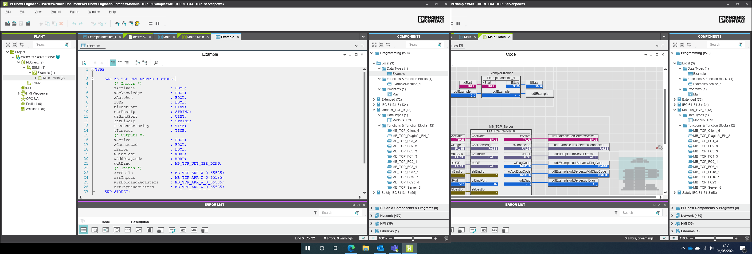 Hi everyone, I have a AXC F 2152 PLC and I try to use ModBus TCP library without success. My initial purpose is checking the examples library (server and client) to understand the performance. However, It doesn’t work for me. I am trying to run Modbus_TCP_client example to connect with a localhost server (I use for that EasyModbusTCP Server Simulator) but client doesn’t connect to the server, nothing happens. In the other hand, I tried to do on the other way around, Modbus_TCP_server example running on the PLC, but same result, nothing happens. At this time, error 9000 appears and the port seems closed (using netstat). Anyone can help me please? Regards,