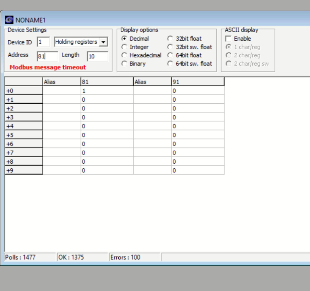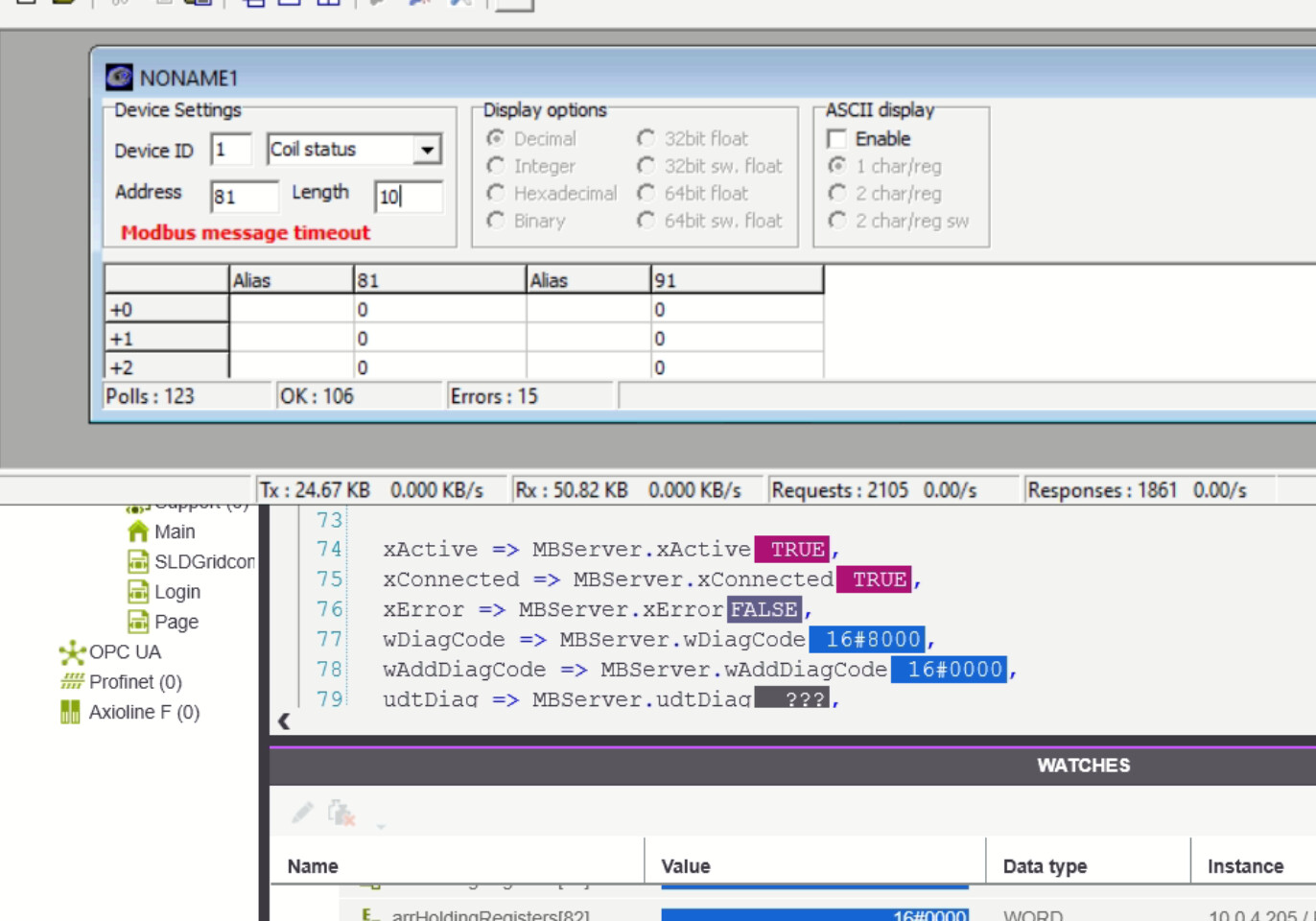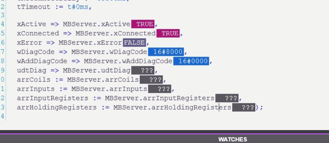 I am using the library Modbus TCP 8. When I try to set up the server, there is always a TCP error. 16#C040 16#xxxx TCP_SEND error 16#xxxx. Refer to appendix. 16#C210 The application tried to send or receive data, and the Socket is not connected (_SOCKET.ACTIVE == False). block settings MB_TCP_Server_51( xActivate := xTestMBServerActivate, xAcknowledge := MBServer.xAcknowledge, xAutoAck := MBServer.xAutoAck, xUDP := MBServer.xUDP_Mode, strBindIp := ‘’, uiBindPort := UINT#504, strDestIp := ‘’, uiDestPort := UINT#0, tReconnectDelay := t#500ms, tTimeout := t#0s, uiOffsetInputRegister := UINT#150, uiOffsetHoldingRegister := UINT#99, uiOffsetInputs := UINT#50, uiOffsetCoils := UINT#0, xActive => MBServer.xActive, xConnected => MBServer.xConnected, xError => MBServer.xError, wDiagCode => MBServer.wDiagCode, wAddDiagCode => MBServer.wAddDiagCode, udtDiag => MBServer.udtDiag, arrModbusData := MBServer.arrModbusData);