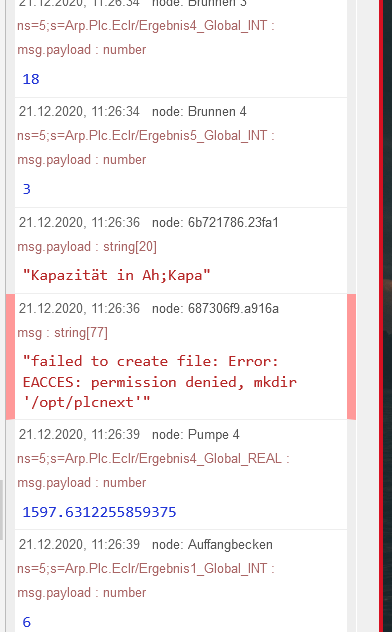 Can someone please tell me what I need to set/change so that Node-Red can create/delete/change/overwrite these files at any time? The following error message : “Error creating file: Error: EACCES: permission denied, mkdir ‘/opt/plcnext’” Meinen Node-Red Flow : [{“id”:“687306f9.a916a”,“type”:“file”,“z”:“f6f2187d.f17ca8”,“name”:“”,“filename”:“/opt/plcnext/logger.csv”,“appendNewline”:true,“createDir”:true,“overwriteFile”:“true”,“encoding”:“none”,“x”:960,“y”:100,“wires”:[]},{“id”:“91881442.f40e2”,“type”:“inject”,“z”:“f6f2187d.f17ca8”,“name”:“”,“props”:[{“p”:“payload”},{“p”:“topic”,“vt”:“str”}],“repeat”:“”,“crontab”:“”,“once”:false,“onceDelay”:0.1,“topic”:“”,“payload”:“”,“payloadType”:“date”,“x”:270,“y”:100,“wires”:[[“6fae87cc.d45538”]]},{“id”:“6fae87cc.d45538”,“type”:“function”,“z”:“f6f2187d.f17ca8”,“name”:“”,“func”:“var capa = flow.get("capa") || 0;\ flow.set ("ccapa_Ah",capa);\ \ return {payload:"Kapazität in Ah;Kapa"};”,“outputs”:1,“noerr”:0,“initialize”:“”,“finalize”:“”,“x”:440,“y”:100,“wires”:[[“6b721786.23fa1”,“687306f9.a916a”]]},{“id”:“6b721786.23fa1”,“type”:“debug”,“z”:“f6f2187d.f17ca8”,“name”:“”,“active”:true,“tosidebar”:true,“console”:false,“tostatus”:false,“complete”:“false”,“statusVal”:“”,“statusType”:“auto”,“x”:670,“y”:40,“wires”:}] Attached is a picture of the flow Thanks for you help guys! nilsbaurx