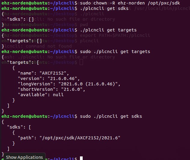 Hey, as you installed the SDK using sudo you probably do not have permissions to the SDK using the plcncli without sudo… Either change the permissions of the folder /opt/pxc/sdk or execute the command using sudo sudo chown -R ehz-norden /opt/pxc/sdk
