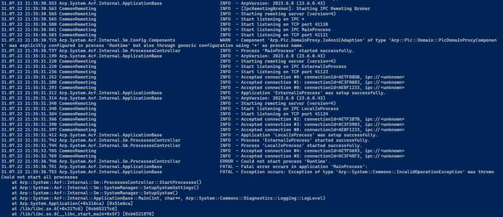 I tried to do some debugging and I could find out which line leads to the InvalidOperationException, it seems to be here: image.pngThe problem happens in the function call to ArpPlcIo_GetBufferPtrByPortNam . How do we get this example to run? What should we check to make sure our set up is correct?
