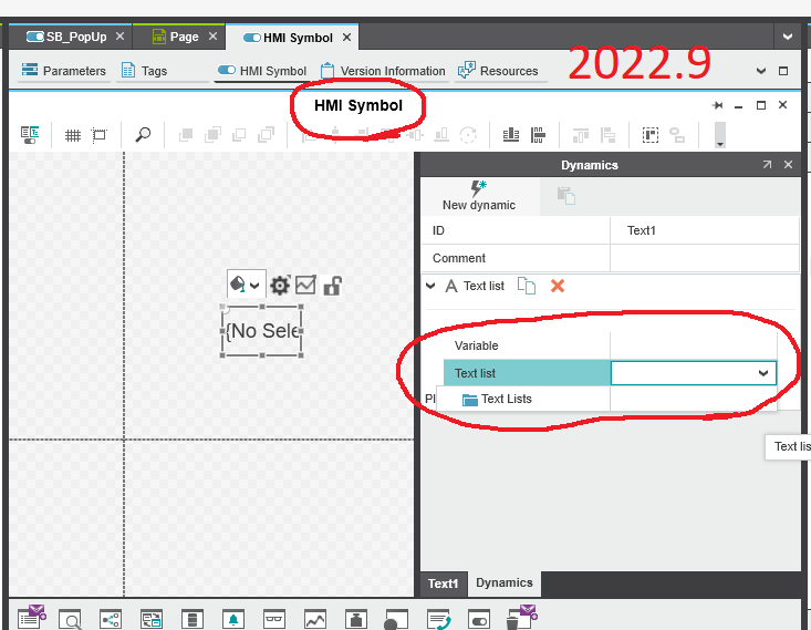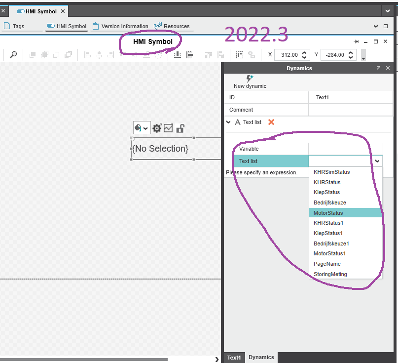 I have been testing our project in PLCnext Engineer 2022.9 and from the start I am getting errors because of the text lists in the HMI symbols. I tested it in different versions of PLCnext Engineer and it seems in version 2022.9 it is not possible anymore to use text lists in HMI symbols in the Dynamics of Text fields. It is not available anymore for selection!?