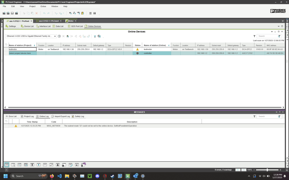 I am able to get the profinet to show the device status as OK (shown above), but as soon as i move to a different tab and come back it immediately gives this warning below and unmerges the revision number.