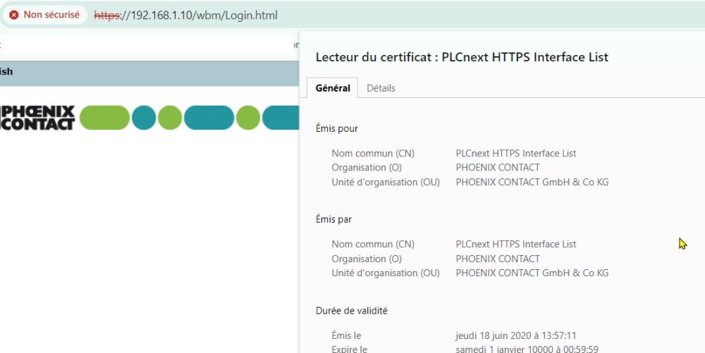 3: go to the WBM and find the certificate manager: In WBM2, this is in the left menu under Security → Certificate management. Open that page and select the tab named “identity stores”. In this list there is an item called HTTPS Self Signed. Expand it and press edit button. There are two rows, press edit on the top row and select your new plc.pem file. Press OK, and now the bottom line will complain as the key does not match. Edit the bottom line and upload the plc.crt file. All should be good now. Reboot the device.