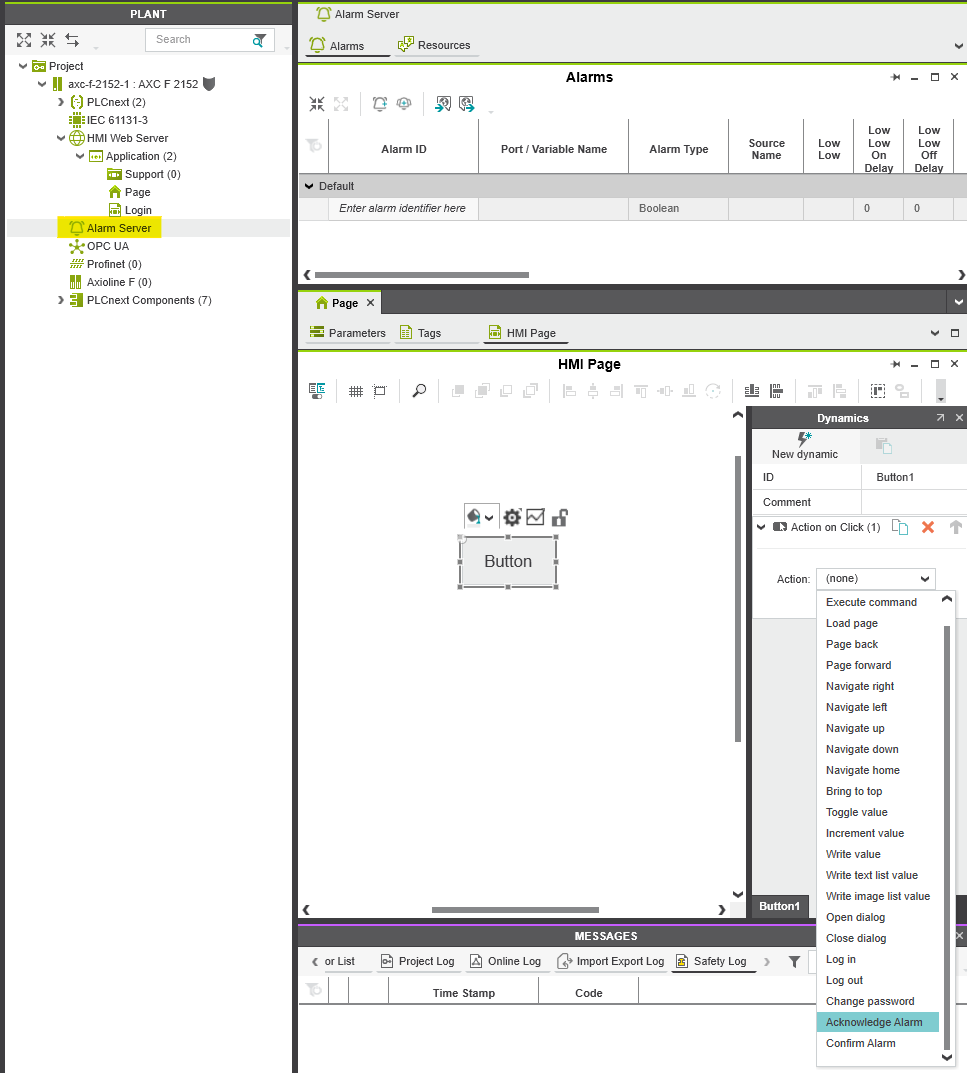 Trying to add a few alarms in the alarm server and linking it to the “acknowledge alarm” action got me nowhere unfortunately. It seems like this new alarming stuff is still in development and not ready for HMI yet